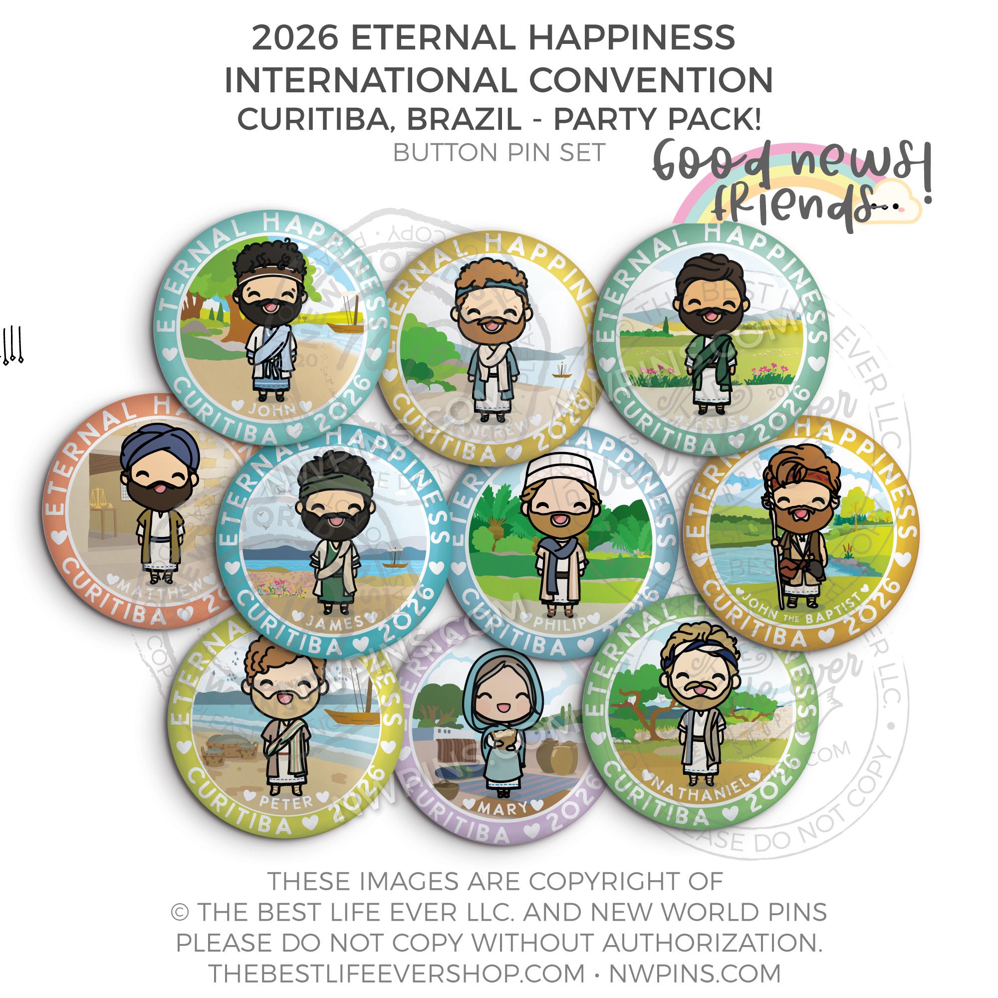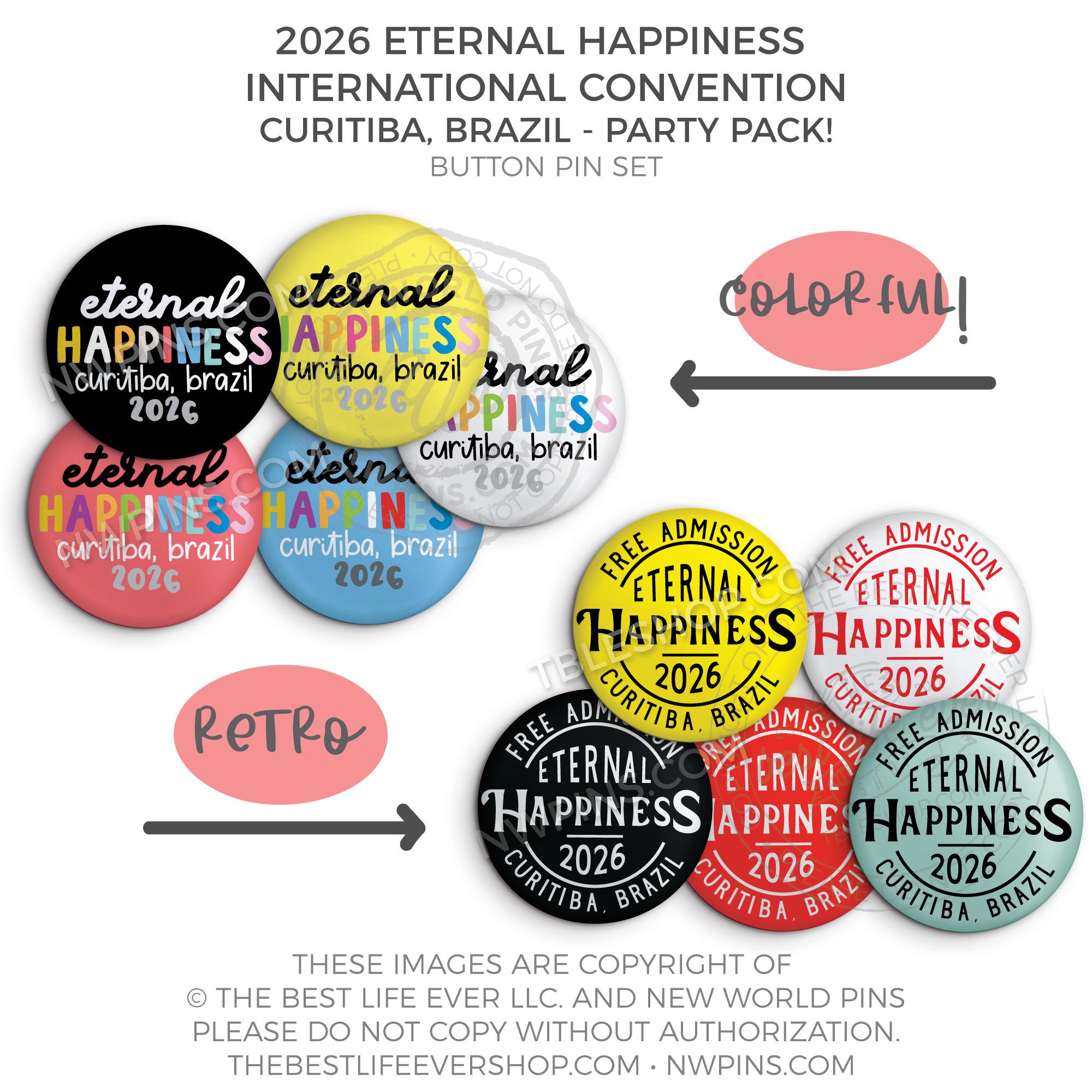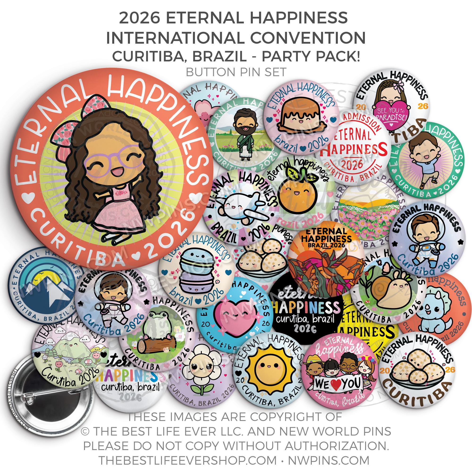 Get ready for your convention with our party pack! We will send a random selection of all of our 2026 Eternal Happiness Convention Brazil International Button Pins.