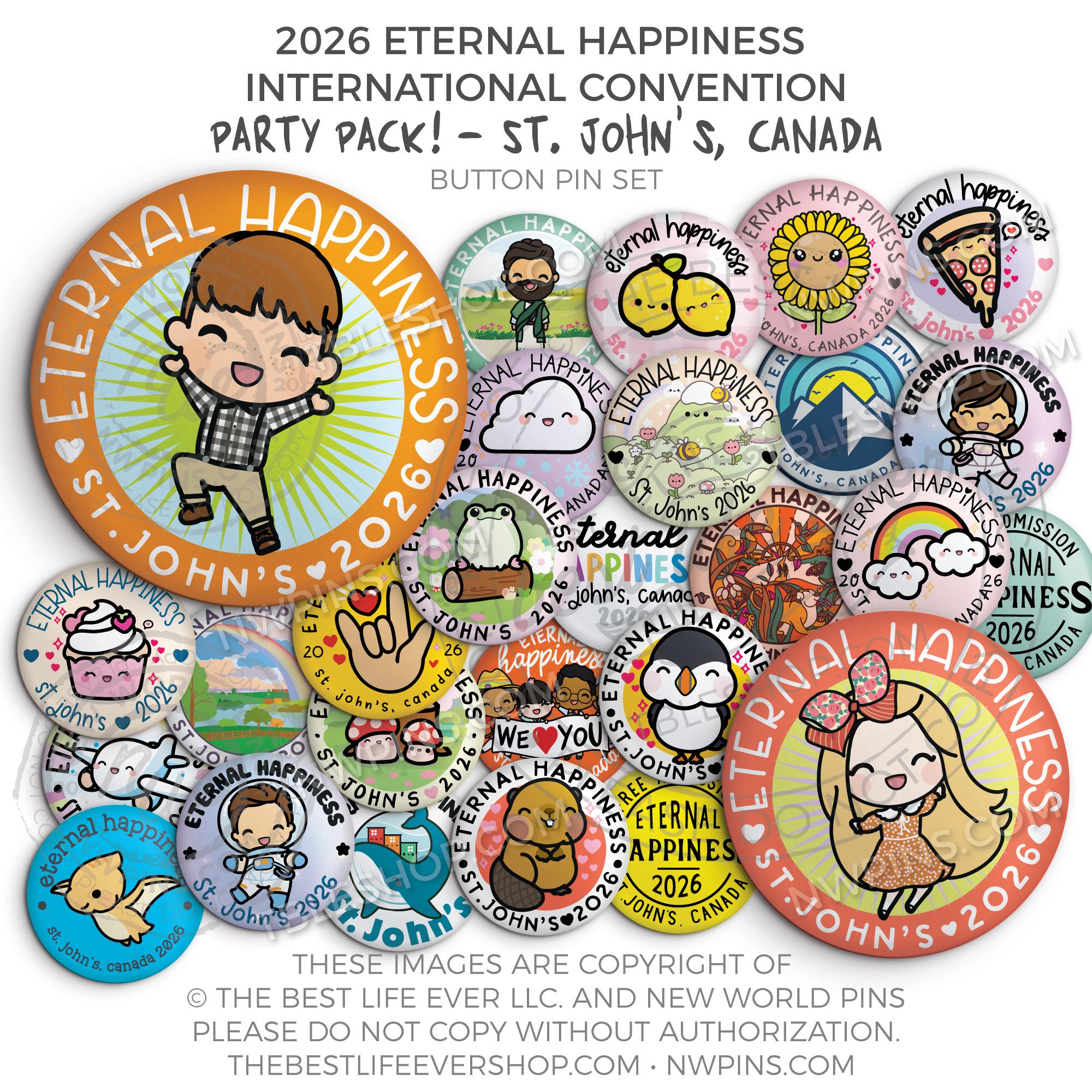 Get ready for your convention with our party pack! We will send a random selection of all of our 2026 Eternal Happiness Convention St. John's Canada International Button Pins.